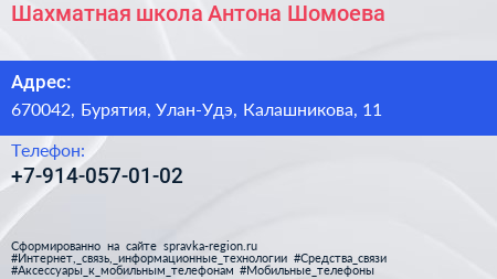 Шахматная школа Антона Шомоева по адресу 670042, Бурятия, Улан-Удэ, Калашникова, 11 в дальнейшем Организация, размещена в следующих категориях: