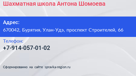 Шахматная школа Антона Шомоева по адресу 670042, Бурятия, Улан-Удэ, проспект Строителей, 66 в дальнейшем Организация, размещена в следующих категориях: