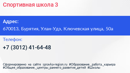 Спортивная школа №3 по адресу 670013, Бурятия, Улан-Удэ, Ключевская улица, 50а в дальнейшем Организация, размещена в следующих категориях: