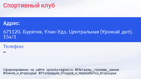 Спортивный клуб по адресу 671120, Бурятия, Улан-Удэ, Центральная (Урожай днт), 15а/1 в дальнейшем Организация, размещена в следующих категориях: