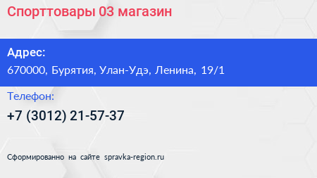 Спорттовары 03, магазин по адресу 670000, Бурятия, Улан-Удэ, Ленина, 19/1 в дальнейшем Организация, размещена в следующих категориях: