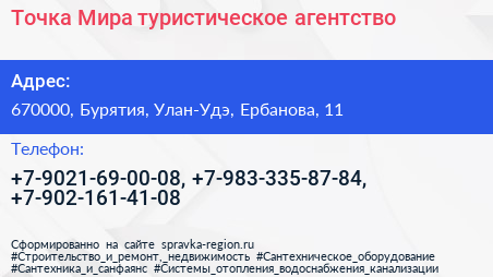 Точка Мира, туристическое агентство по адресу 670000, Бурятия, Улан-Удэ, Ербанова, 11 в дальнейшем Организация, размещена в следующих категориях: