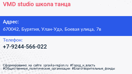 VMD studio, школа танца по адресу 670042, Бурятия, Улан-Удэ, Боевая улица, 7в в дальнейшем Организация, размещена в следующих категориях: