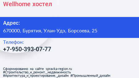 Wellhome, хостел по адресу 670000, Бурятия, Улан-Удэ, Борсоева, 25 в дальнейшем Организация, размещена в следующих категориях: