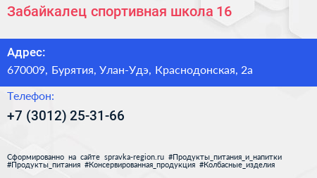 Забайкалец, спортивная школа №16 по адресу 670009, Бурятия, Улан-Удэ, Краснодонская, 2а в дальнейшем Организация, размещена в следующих категориях: