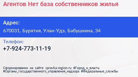 Агентов-Нет, база собственников жилья по адресу 670031, Бурятия, Улан-Удэ, Бабушкина, 34 в дальнейшем Организация, размещена в следующих категориях: