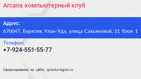 Arcana, компьютерный клуб по адресу 670047, Бурятия, Улан-Удэ, улица Сахьяновой, 21 блок 1 в дальнейшем Организация, размещена в следующих категориях: