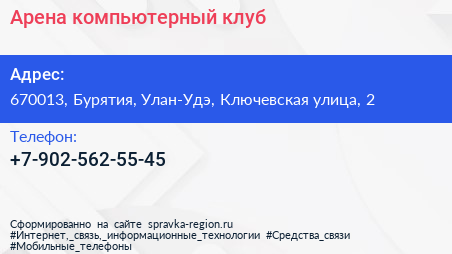 Арена, компьютерный клуб по адресу 670013, Бурятия, Улан-Удэ, Ключевская улица, 2 в дальнейшем Организация, размещена в следующих категориях: