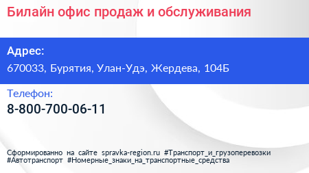 Билайн, офис продаж и обслуживания по адресу 670033, Бурятия, Улан-Удэ, Жердева, 104Б в дальнейшем Организация, размещена в следующих категориях: