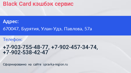 Black Card, кэшбэк-сервис по адресу 670047, Бурятия, Улан-Удэ, Павлова, 57а в дальнейшем Организация, размещена в следующих категориях: