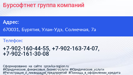 Бурсофтнет, группа компаний по адресу 670031, Бурятия, Улан-Удэ, Солнечная, 7а в дальнейшем Организация, размещена в следующих категориях: