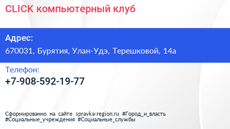 CLICK, компьютерный клуб по адресу 670031, Бурятия, Улан-Удэ, Терешковой, 14а в дальнейшем Организация, размещена в следующих категориях: