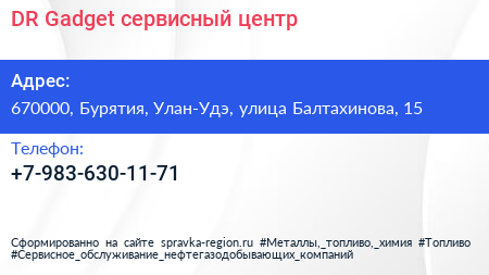 DR Gadget, сервисный центр по адресу 670000, Бурятия, Улан-Удэ, улица Балтахинова, 15 в дальнейшем Организация, размещена в следующих категориях: