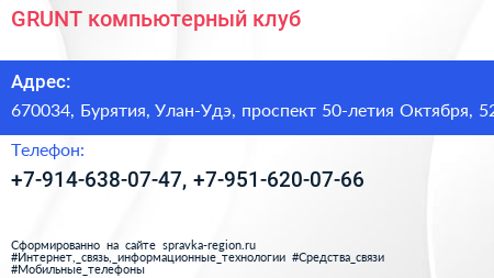 GRUNT, компьютерный клуб по адресу 670034, Бурятия, Улан-Удэ, проспект 50-летия Октября, 52 в дальнейшем Организация, размещена в следующих категориях: