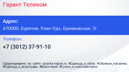 Гарант Телеком по адресу 670000, Бурятия, Улан-Удэ, Ермаковская, 7г в дальнейшем Организация, размещена в следующих категориях: