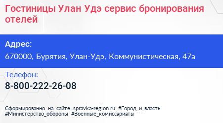 Гостиницы Улан-Удэ, сервис бронирования отелей по адресу 670000, Бурятия, Улан-Удэ, Коммунистическая, 47а в дальнейшем Организация, размещена в следующих категориях: