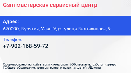 Gsm-мастерская, сервисный центр по адресу 670000, Бурятия, Улан-Удэ, улица Балтахинова, 9 в дальнейшем Организация, размещена в следующих категориях: