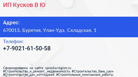 ИП Кусков В.Ю. по адресу 670013, Бурятия, Улан-Удэ, Складская, 1 в дальнейшем Организация, размещена в следующих категориях: