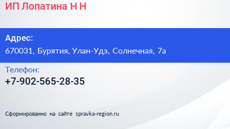 ИП Лопатина Н.Н. по адресу 670031, Бурятия, Улан-Удэ, Солнечная, 7а в дальнейшем Организация, размещена в следующих категориях: