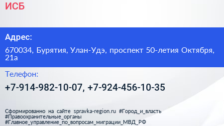 ИСБ по адресу 670034, Бурятия, Улан-Удэ, проспект 50-летия Октября, 21а в дальнейшем Организация, размещена в следующих категориях: