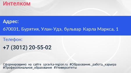Интелком по адресу 670031, Бурятия, Улан-Удэ, бульвар Карла Маркса, 1 в дальнейшем Организация, размещена в следующих категориях:
