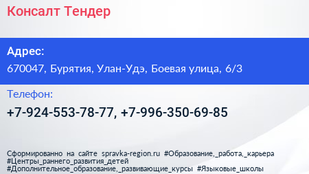 Консалт Тендер по адресу 670047, Бурятия, Улан-Удэ, Боевая улица, 6/3 в дальнейшем Организация, размещена в следующих категориях: