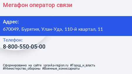 Мегафон, оператор связи по адресу 670049, Бурятия, Улан-Удэ, 110-й квартал, 11 в дальнейшем Организация, размещена в следующих категориях: