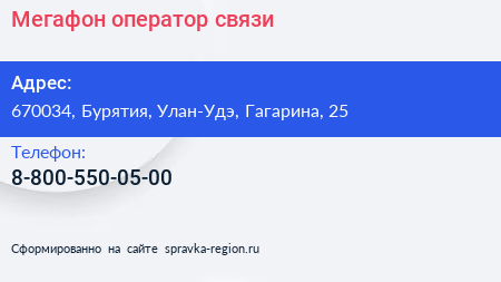 Мегафон, оператор связи по адресу 670034, Бурятия, Улан-Удэ, Гагарина, 25 в дальнейшем Организация, размещена в следующих категориях: