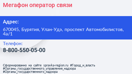 Мегафон, оператор связи по адресу 670045, Бурятия, Улан-Удэ, проспект Автомобилистов, 4а/1 в дальнейшем Организация, размещена в следующих категориях: