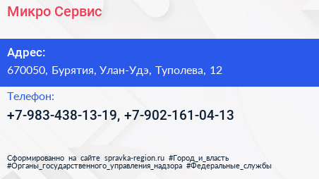 Микро-Сервис по адресу 670050, Бурятия, Улан-Удэ, Туполева, 12 в дальнейшем Организация, размещена в следующих категориях: