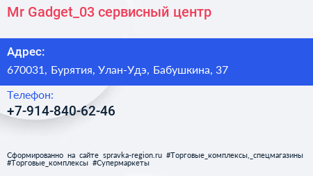 Mr.Gadget_03, сервисный центр по адресу 670031, Бурятия, Улан-Удэ, Бабушкина, 37 в дальнейшем Организация, размещена в следующих категориях: