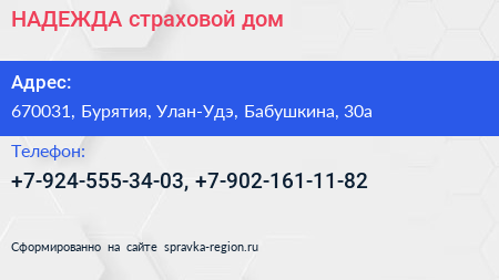 НАДЕЖДА, страховой дом по адресу 670031, Бурятия, Улан-Удэ, Бабушкина, 30а в дальнейшем Организация, размещена в следующих категориях: