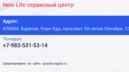 New Life, сервисный центр по адресу 670034, Бурятия, Улан-Удэ, проспект 50-летия Октября, 11 в дальнейшем Организация, размещена в следующих категориях: