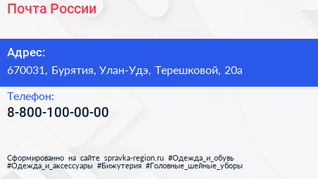 Почта России по адресу 670031, Бурятия, Улан-Удэ, Терешковой, 20а в дальнейшем Организация, размещена в следующих категориях: