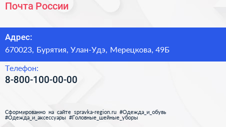Почта России по адресу 670023, Бурятия, Улан-Удэ, Мерецкова, 49Б в дальнейшем Организация, размещена в следующих категориях:
