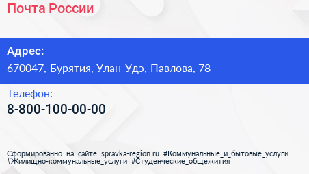 Почта России по адресу 670047, Бурятия, Улан-Удэ, Павлова, 78 в дальнейшем Организация, размещена в следующих категориях: