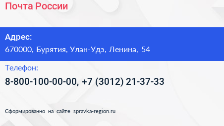 Почта России по адресу 670000, Бурятия, Улан-Удэ, Ленина, 54 в дальнейшем Организация, размещена в следующих категориях: