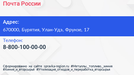 Почта России по адресу 670000, Бурятия, Улан-Удэ, Фрунзе, 17 в дальнейшем Организация, размещена в следующих категориях:
