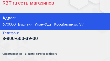 RBT.ru, сеть магазинов по адресу 670000, Бурятия, Улан-Удэ, Корабельная, 39 в дальнейшем Организация, размещена в следующих категориях: