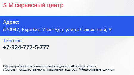 S & M, сервисный центр по адресу 670047, Бурятия, Улан-Удэ, улица Сахьяновой, 9 в дальнейшем Организация, размещена в следующих категориях: