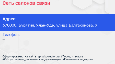 Сеть салонов связи по адресу 670000, Бурятия, Улан-Удэ, улица Балтахинова, 9 в дальнейшем Организация, размещена в следующих категориях: