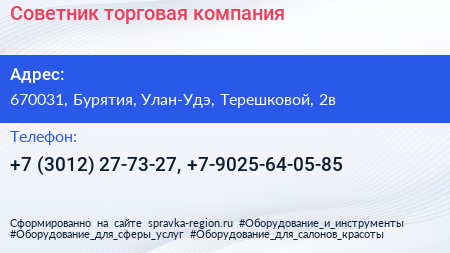 Советник, торговая компания по адресу 670031, Бурятия, Улан-Удэ, Терешковой, 2в в дальнейшем Организация, размещена в следующих категориях: