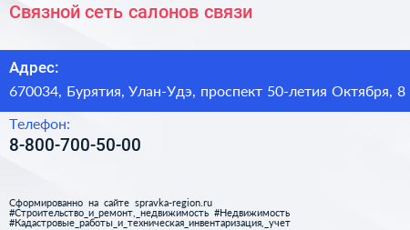Связной, сеть салонов связи по адресу 670034, Бурятия, Улан-Удэ, проспект 50-летия Октября, 8 в дальнейшем Организация, размещена в следующих категориях:
