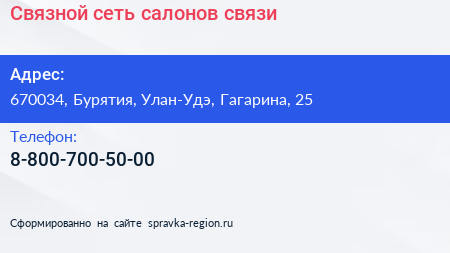 Связной, сеть салонов связи по адресу 670034, Бурятия, Улан-Удэ, Гагарина, 25 в дальнейшем Организация, размещена в следующих категориях: