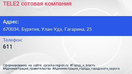 TELE2, сотовая компания по адресу 670034, Бурятия, Улан-Удэ, Гагарина, 25 в дальнейшем Организация, размещена в следующих категориях: