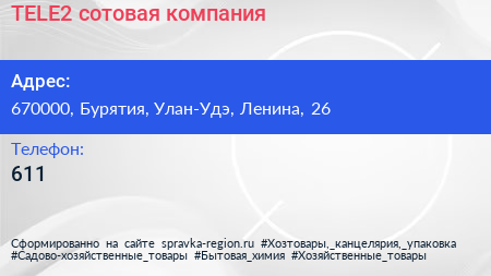TELE2, сотовая компания по адресу 670000, Бурятия, Улан-Удэ, Ленина, 26 в дальнейшем Организация, размещена в следующих категориях:
