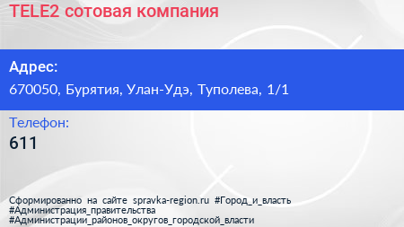 TELE2, сотовая компания по адресу 670050, Бурятия, Улан-Удэ, Туполева, 1/1 в дальнейшем Организация, размещена в следующих категориях: