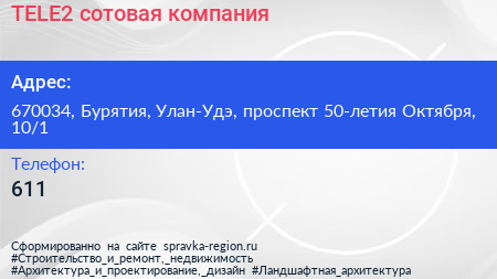 TELE2, сотовая компания по адресу 670034, Бурятия, Улан-Удэ, проспект 50-летия Октября, 10/1 в дальнейшем Организация, размещена в следующих категориях: