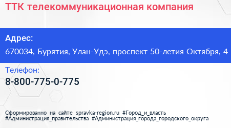 ТТК, телекоммуникационная компания по адресу 670034, Бурятия, Улан-Удэ, проспект 50-летия Октября, 4 в дальнейшем Организация, размещена в следующих категориях: