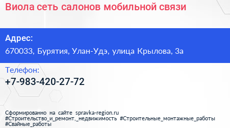 Виола, сеть салонов мобильной связи по адресу 670033, Бурятия, Улан-Удэ, улица Крылова, 3а в дальнейшем Организация, размещена в следующих категориях: